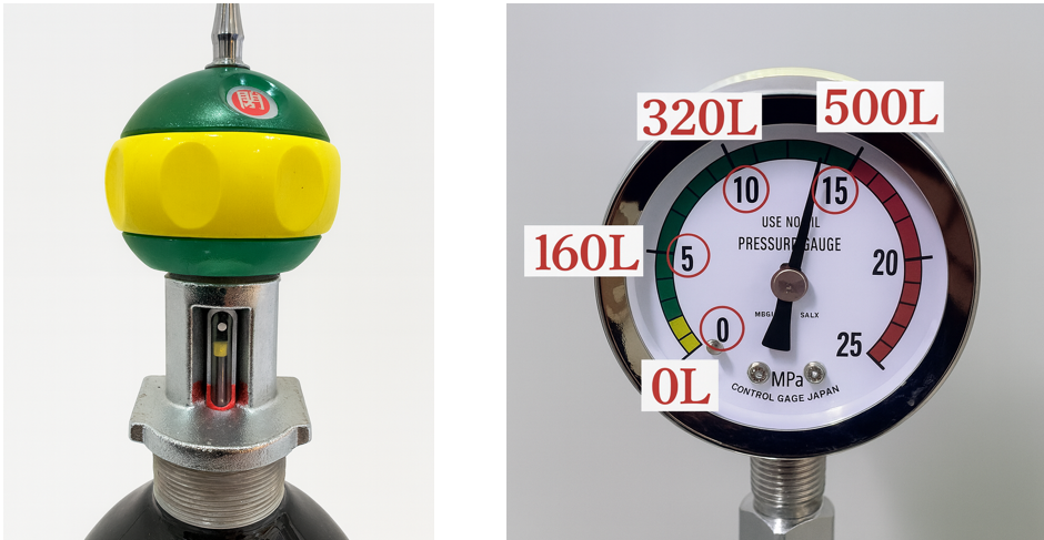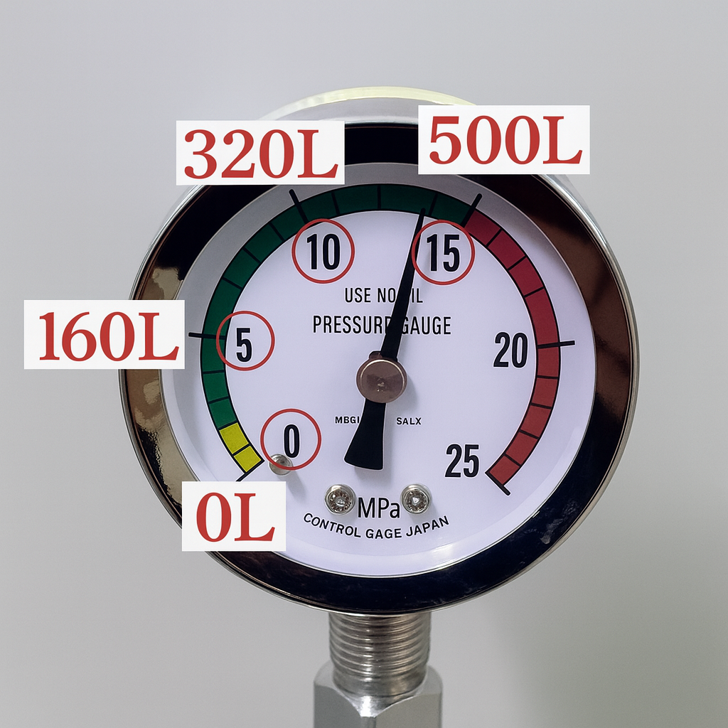 圧力計は14.7MPa(≒15MPa)で満タン、10MPaで残2/3、5MPaで残1/3となります。こんな感じ↓
